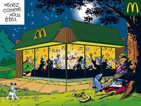 Les détournements de scènes de BD (de cène aussi) sont monnaie courante, cette fois c’est le géant des hamburgers américains, Mc Donald’s, qui s’y colle avec des Gaulois que nous connaissons bien dans nos contrées franchouillardes.